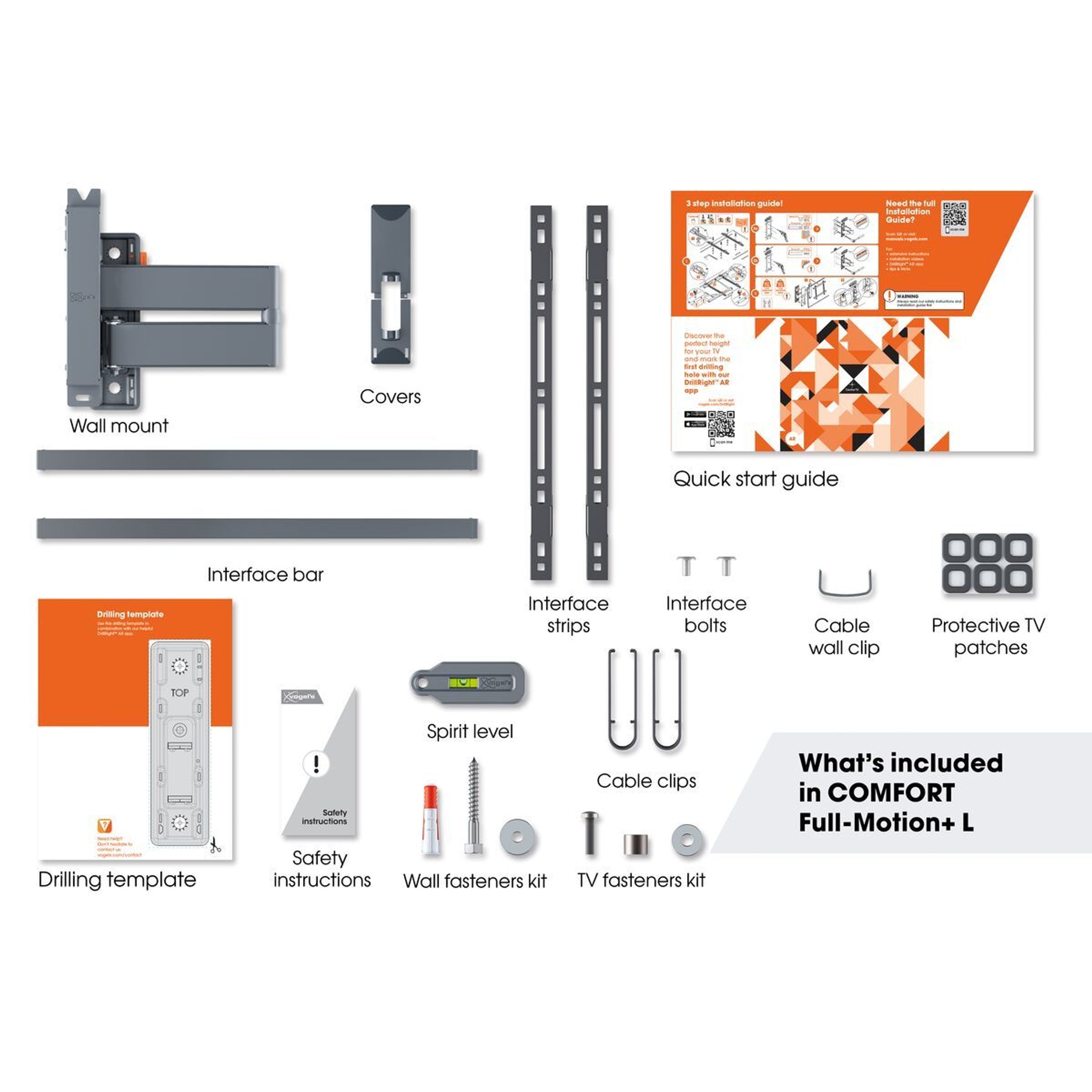 The COMFORT Full-Motion+ TV wall mount is easy to install. A drilling template, screws, Fischer® DuoPower plugs, cable ties and a spirit level are included. Simply mark out the first drill hole with our free DrillRight app. Is your TV slightly crooked? No problem. You can easily make it level, even after installation.